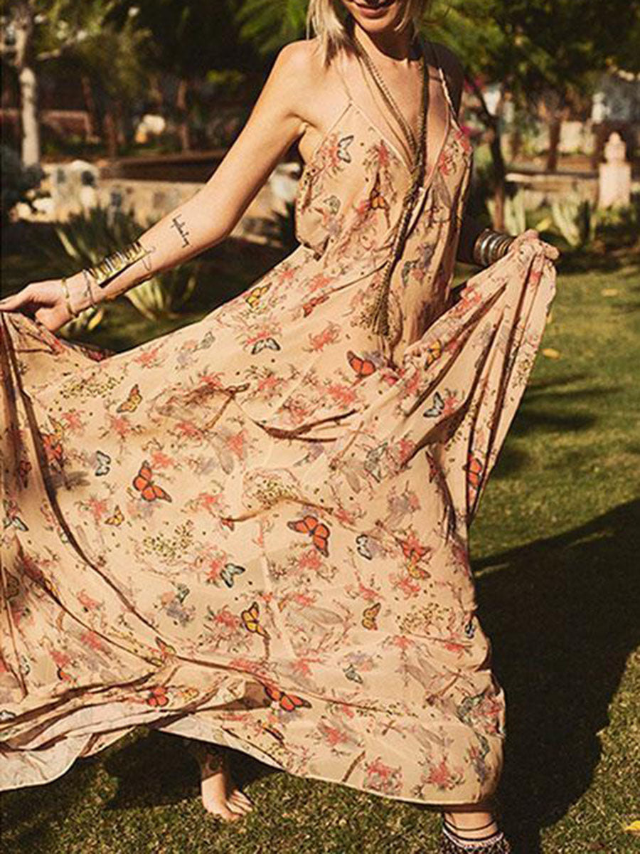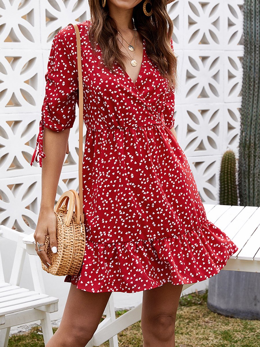 Sweet Chiffon Printed V-Neck Ruffle Mini Dress