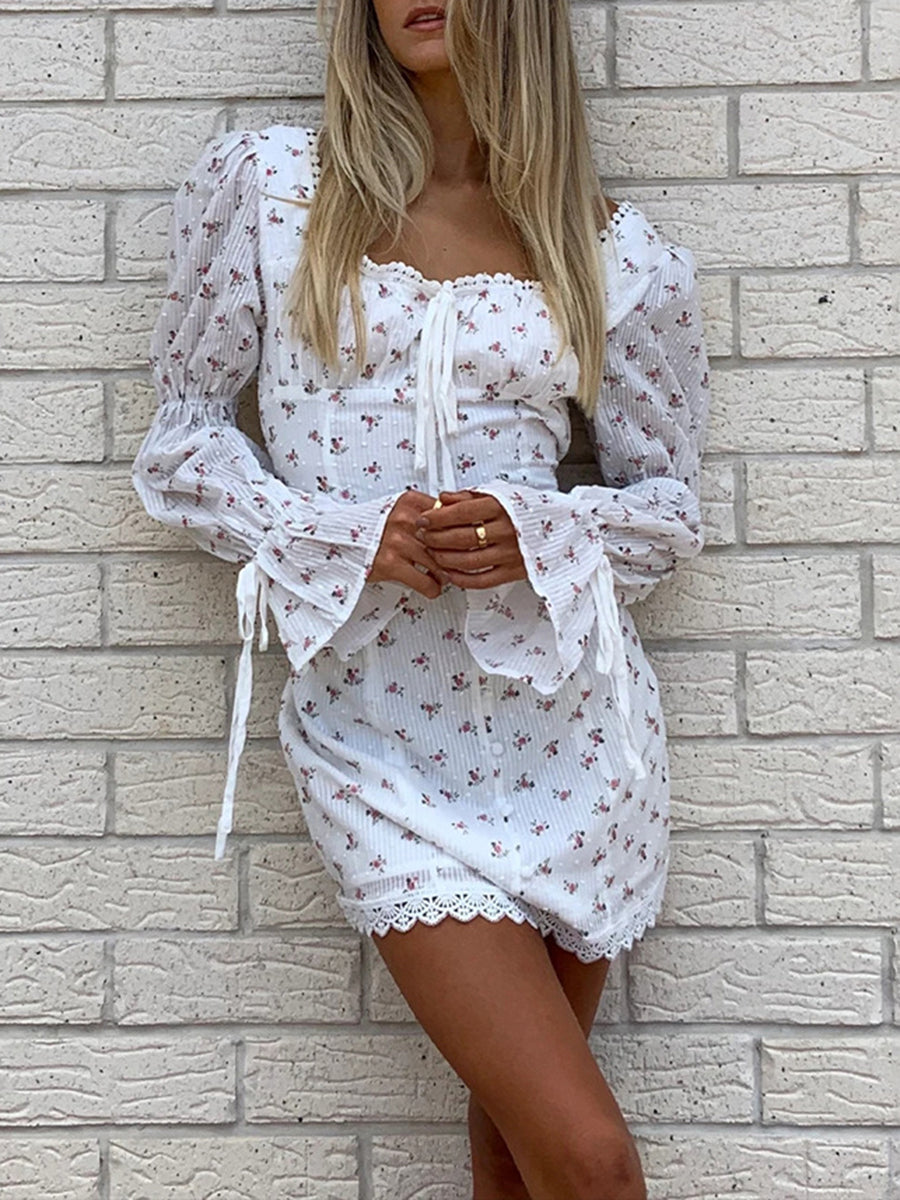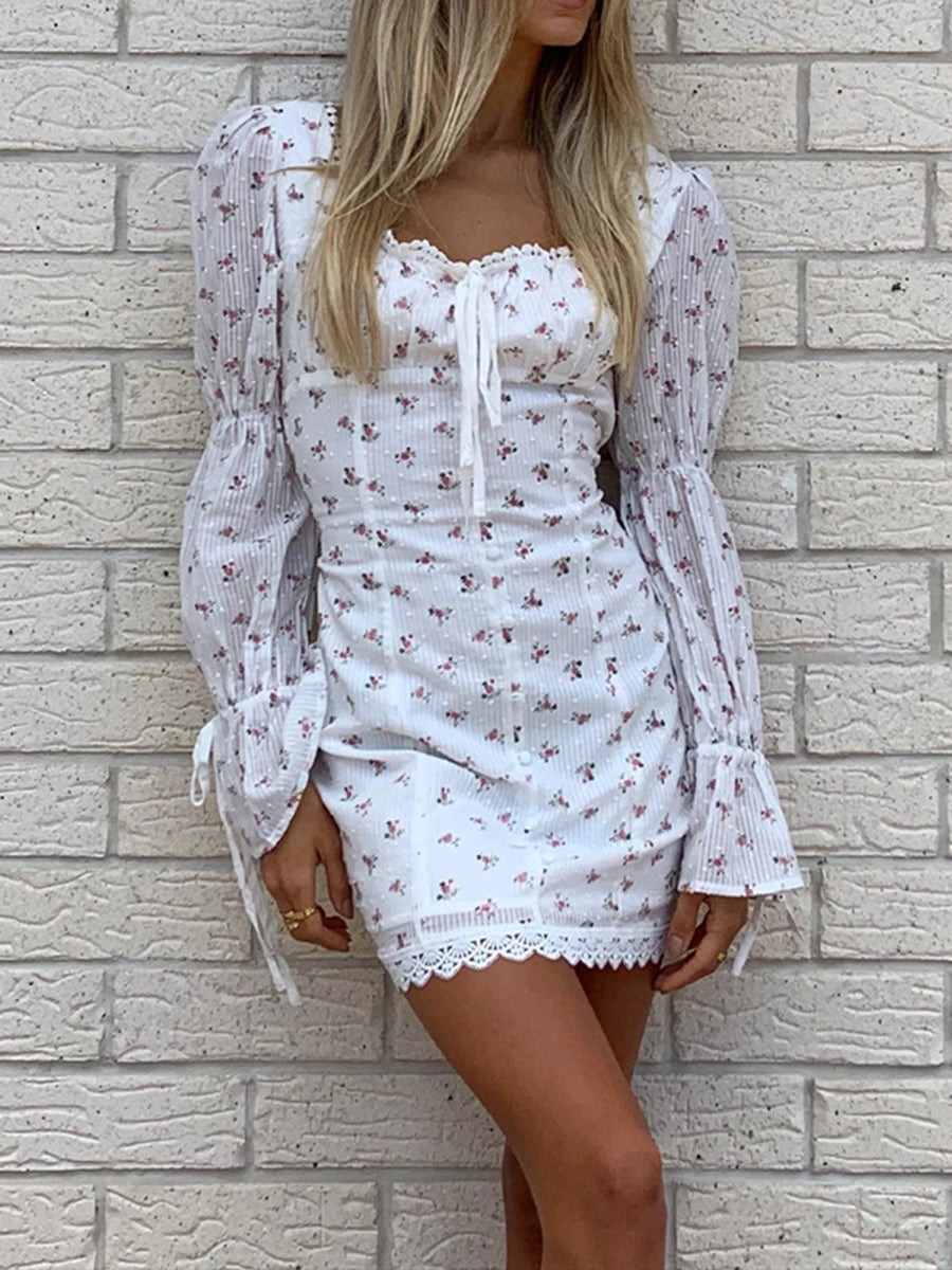Product: Pleated Square Collar Long Sleeve Slim Floral Dress