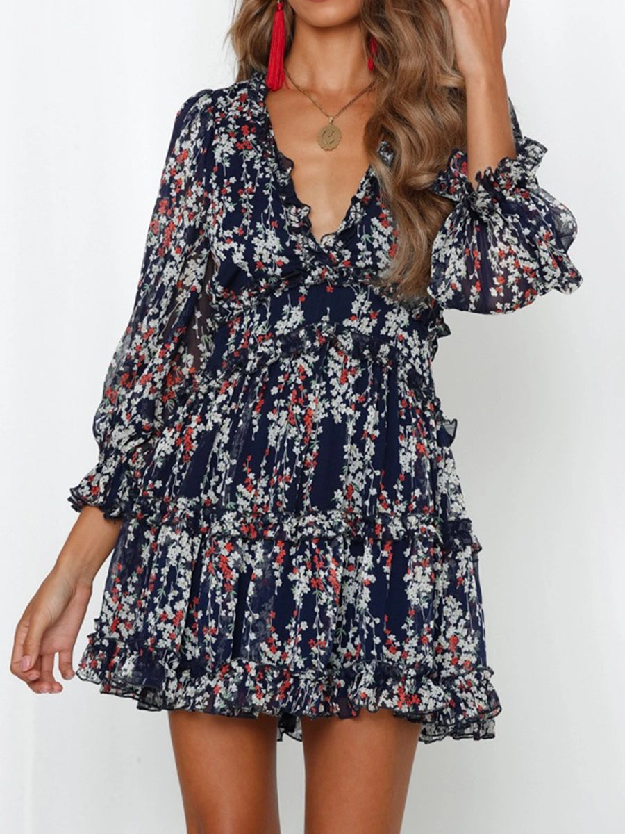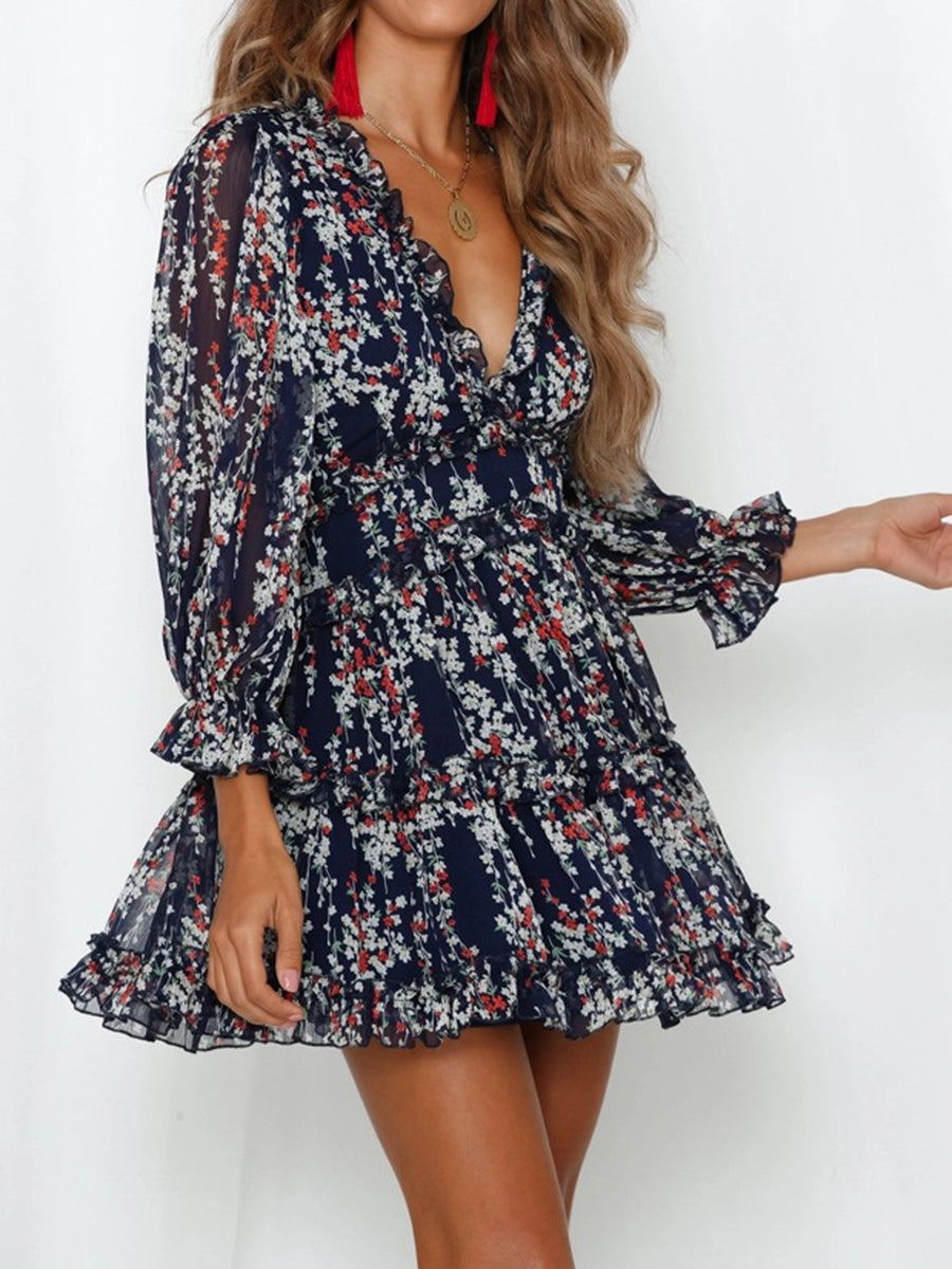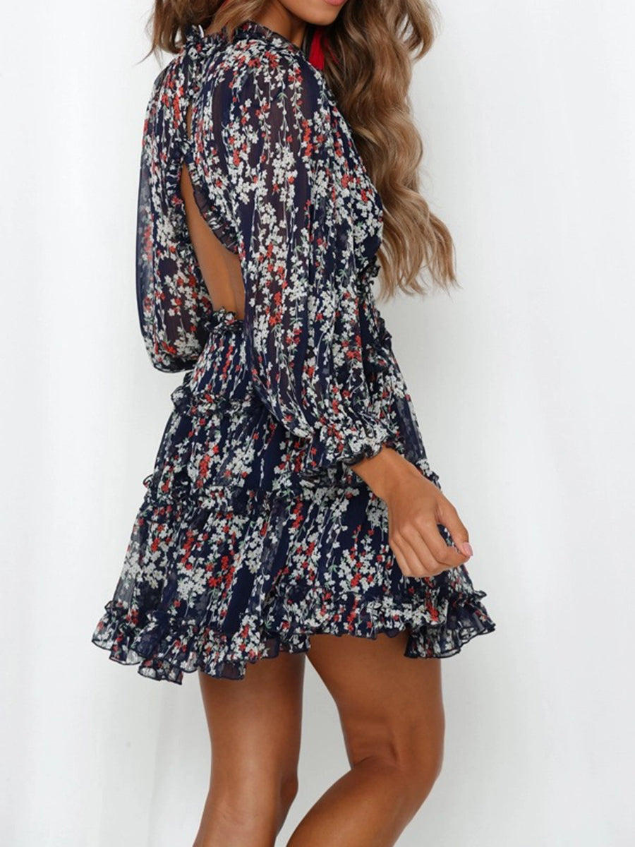 Backless V-neck Puff Sleeve Long Sleeve Mini Dress