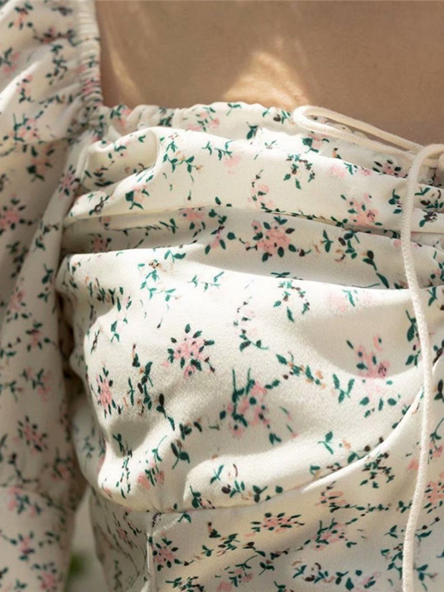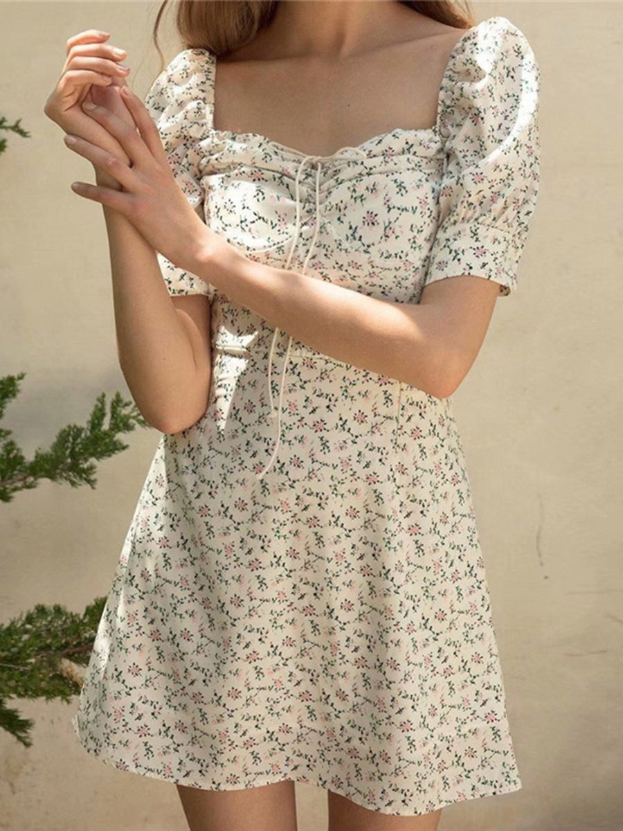 Summer Square Neck Floral Drawstring Dress