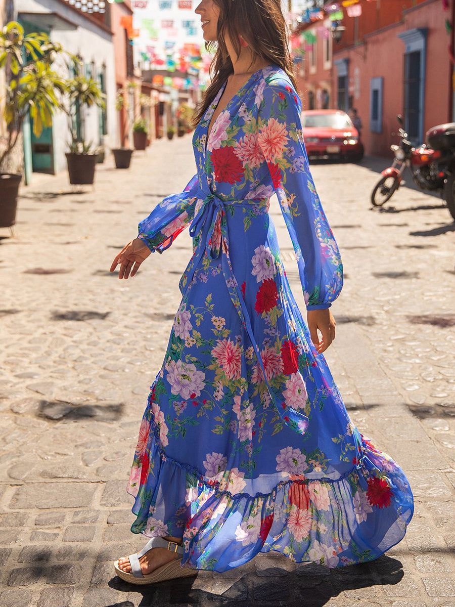 Product: Women Floral Long Sleeve Lace-Up Maxi Dress